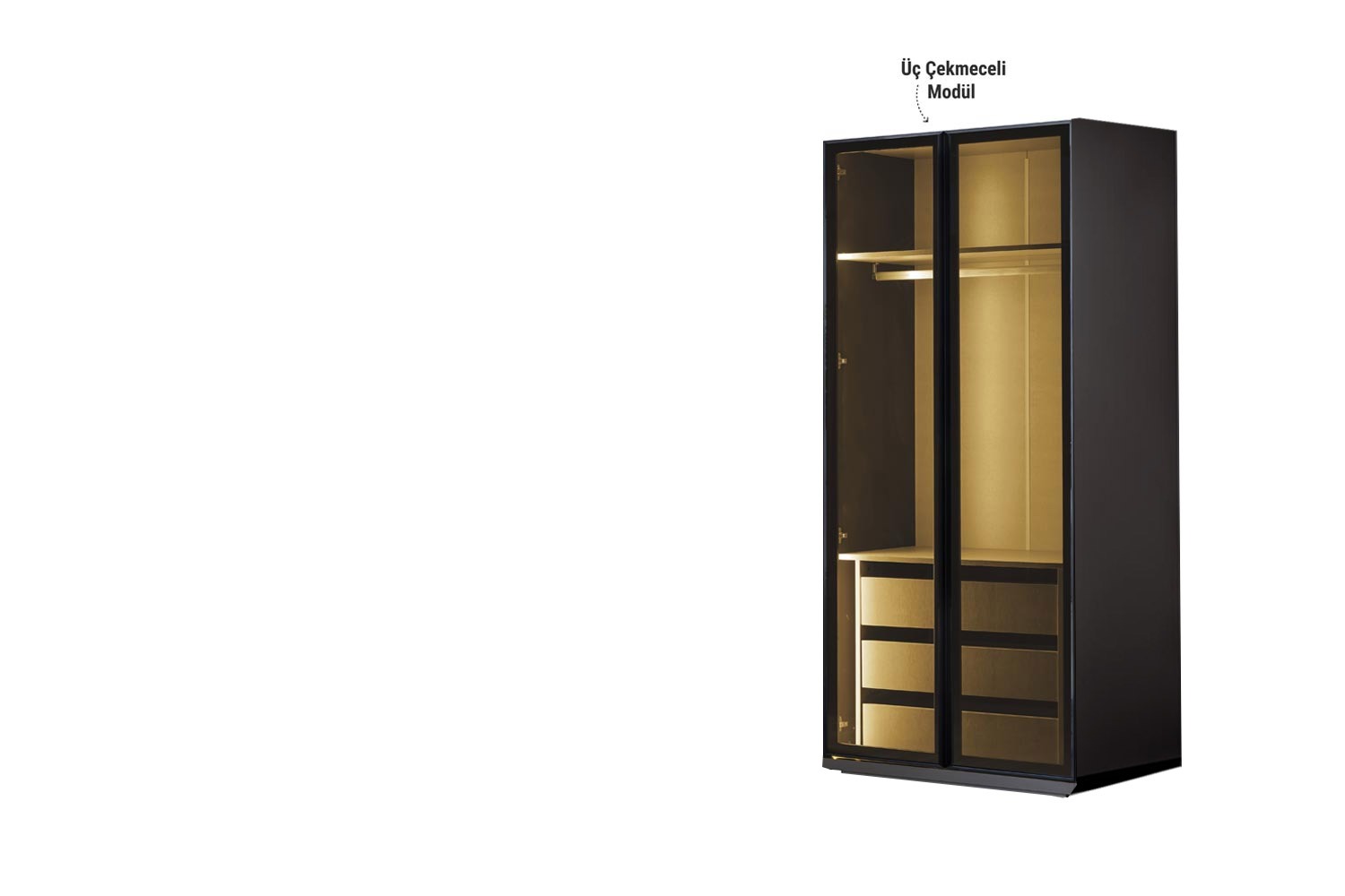 Dolap Fonksiyonu: Kapaklarda frenli menteşeler kullanılmışır. Çekmeceli dolapların içerisinde 3'er adet çekmece ve 1'er adet alüminyum askılık yer almaktadır. Pantalonluklu dolabın içerisinde pantolon askı rayı ve 1 adet alüminyum askılık bulunmaktadır. Köşe dolabın içinde ise 1 adet alüminyum askılık mevcuttur.