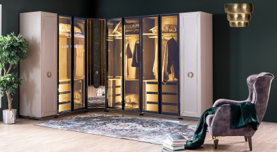 Gardırop Malzemesi: Suntalam, tek kapılı dolap kapaklarının etrafında ahşap çerçeve profiller yer almaktadır ve ön yüzeylerde altın yaldızlı sibu kullanılmıştır. Çekmeceli dolapların ve pantalonluklu dolabın kapakları alüminyum çerçeveli reflekte camdan yapılmıştır. Köşe dolap kapak etrafında ahşap çerçeve profiller yer almaktadır ve ön yüzeylerde PVC kaplı MDF profil kullanılmıştır. Çekmeceli dolaplarda ve pantalonluklu dolaplarda dokunmatik olarak açılıp kapanabilen led aydınlatma sistemi bulunmaktadır. Köşe dolap aynası lazemli bronz aynadır.