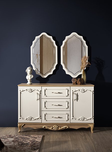 Şifonyer Malzemesi Suntalam malzemeden üretilmiştir. Kapaklarda boyalı plastik desen mevcuttur. Ayaklar plastiktir. Kupları metal üzerinde porselen bulunan malzemeden yapılmıştır. Çekmece rayı frenlidir.