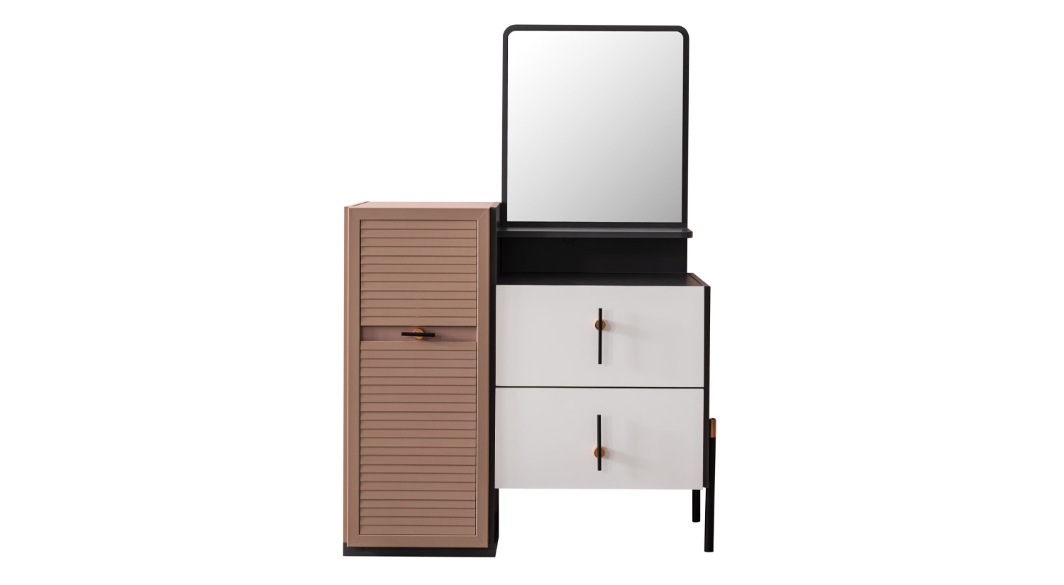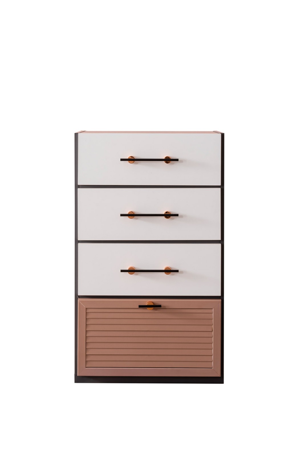 Takımın genelinde yer alan antrasit, beyaz ve pembe renk uygulaması takımın kimliğine katkı sağlamıştır. Tüm kapak ve çekmecelerde kendinden frenli mekanizma ile kullanım kolaylığı sağlanırken, farklı tarzda modern metal kulp ve ayak yapısı sayesinde ürüne hem farklı bir tasarım kazandırılmış hem de görsel açıdan zenginleştirilmiştir.