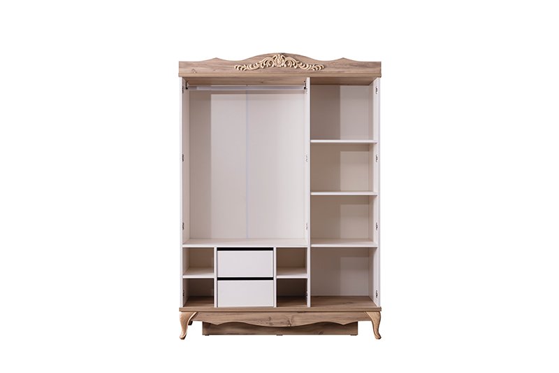Gardırop Malzemesi Suntalam, dolap alt klapa MDF, kapaklar boyalı MDF, kapak önlerinde boyalı plastik desen, üst taçda ise boyalı poliüretan döküm desen yer almakta, sağ kapak arkasında aksesuar olarak perde bulunmaktadır.