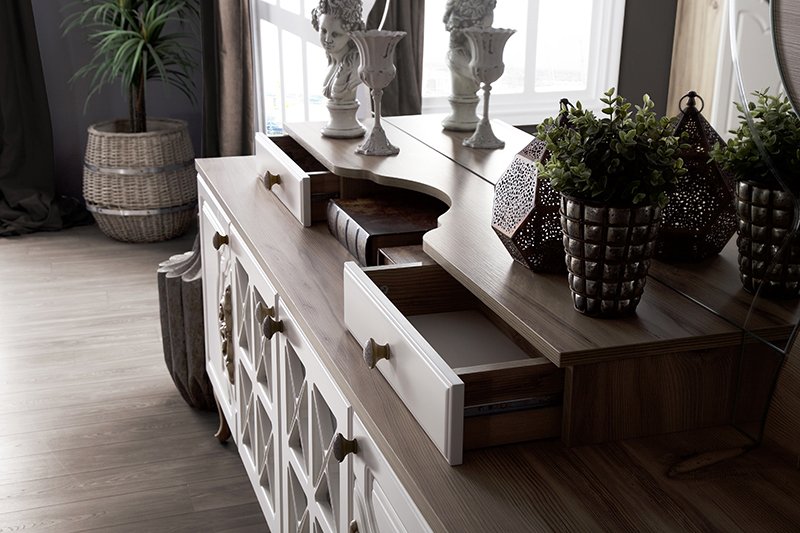 Konsol Malzemesi Gövde Suntalam, alt klapa MDF, kapaklar ve çekmece önleri boyalı MDF. Ayaklar plastiktir. Kupları metal üzerinde desenli taş bulunan malzemeden yapılmıştır. Ayna pano üstünde boyalı döküm desen bulunmaktadır.