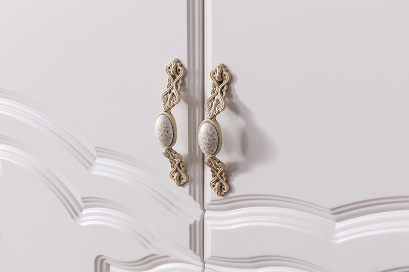 Gardırop Malzemesi Suntalam, dolap alt klapa MDF, kapaklar boyalı MDF, kapak önlerinde boyalı plastik desen, üst taçda ise boyalı poliüretan döküm desen yer almakta, sağ kapak arkasında aksesuar olarak perde bulunmaktadır.
