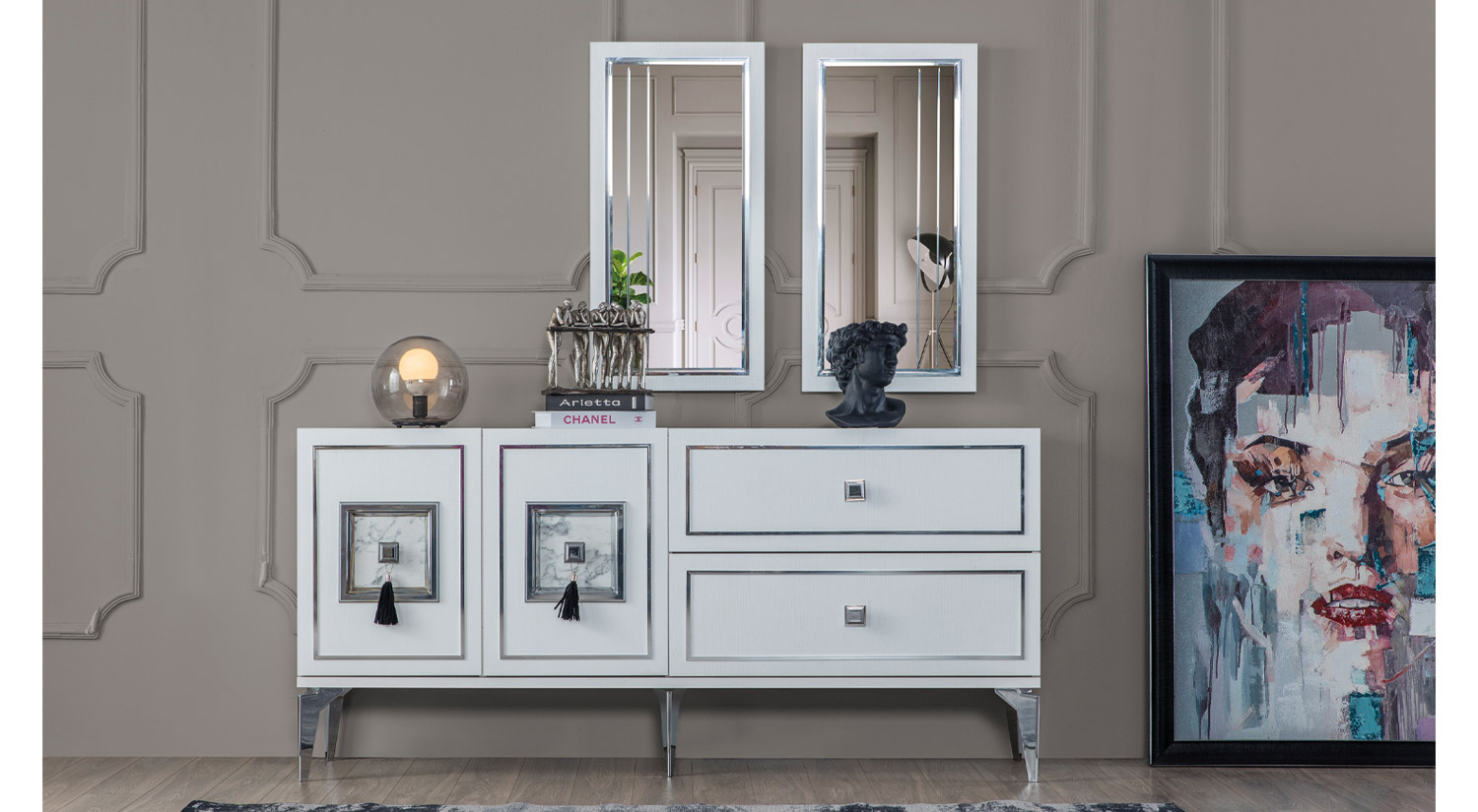 Konsol Malzemesi Melamin kaplı yonga levhadan üretilmiştir. Kapakların üzerinde, çekmece önlerinde ve ayna panoda krom renkli plastik sibu profil kullanılmıştır. Kapaklarda kendinden frenli menteşeler yer almaktadır. Ayrıca kapaklarda görsel amaçlı aksesuar olarak kare çerçeve şeklinde krom plastik gövdeli malzeme bulunmaktadır. Kulpları krom kaplı plastik kulptur. Kapaklardaki kare desenlere takılan kulplarda aynı zamanda siyah nubuk püskül yer almaktadır. Ayakları krom kaplı plastiktir.  Çekmece rayları çift açılımlı teleskopik raydır.