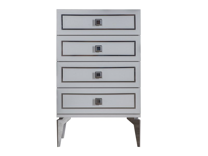 Komodin Malzemesi Melamin kaplı yonga levhadan üretilmiştir. Çekmece önlerinde krom renkli plastik sibu profil kullanılmıştır. Ayakları krom kaplı plastiktir. Kulpları krom kaplı plastik kulptur. Çekmece rayları çift açılımlı teleskopik raydır.