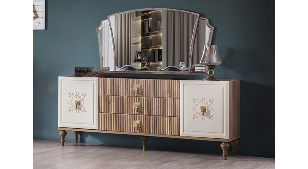 Konsol Malzemesi Suntalam malzemeden üretilmiştir. Ayakları boyalı ahşaptır. Kulpları altın kaplı metaldir.Kapaklarda cnc işlemeli mdf boyanarak kullanılmıştır.Çekmecelerde ahşap desenli mebran kullanılmıştır.Çekmece rayları frenlidir.
