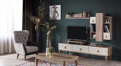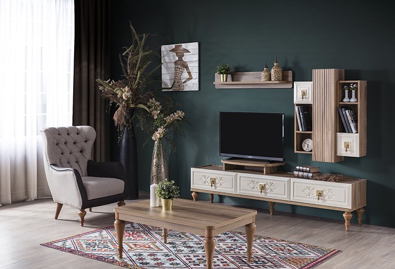 TV Ünitesi Malzemesi Suntalam malzemeden üretilmiştir. Ayakları boyalı ahşaptır. Kulpları altın kaplı metaldir.Üst uzun kapakta ahşap desenli mebran kullanılmıştır.Çekmecelerde ve üst küçük kapaklarda cnc işlemeli mdf boyanarak kullanılmıştır.Çekmece rayları frenlidir.