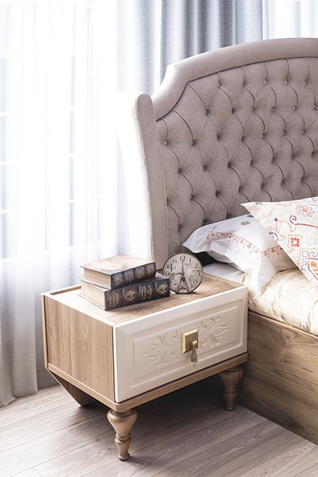 Komodin Malzemesi Suntalam malzemeden üretilmiştir. Çekmece önü mdf üzerine cnc işleme yapılıp boyanmıştır.Ayakları boyalı ahşaptır. Kulpları metal olup altın kaplanmıştır.Çekmece rayları frenlidir.