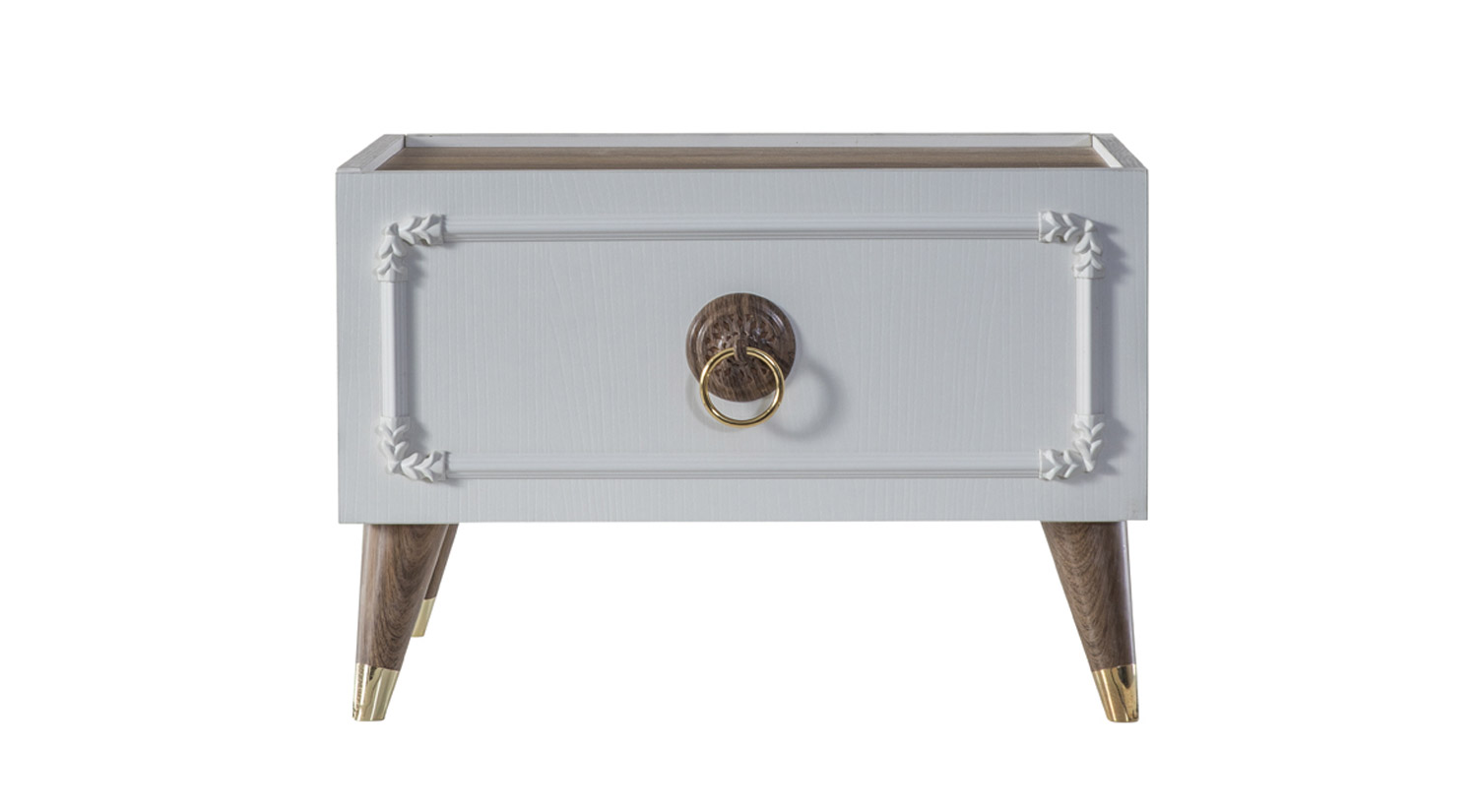 Komodin Malzemesi Suntalam malzemeden üretilmiştir. Çekmece önünde boyalı MDF profil bulunmaktadır. Ayaklar plastiktir. Kulpları plastik gövde ve metal tutamaktan oluşmaktadır. Çekmece rayları frenlidir.