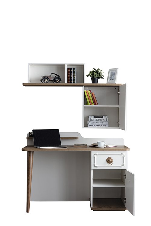 Çalışma Masası Malzemesi Suntalam malzemeden üretilmiştir. Çekmece önünde boyalı MDF profil bulunmaktadır. Kapaklarda boyalı MDF profil ve boyalı plastik desen yer almaktadır. Ayak boyalı ahşaptır. Kulpları plastik gövde ve metal tutamaktan oluşmaktadır. Çekmece rayları frenlidir.
