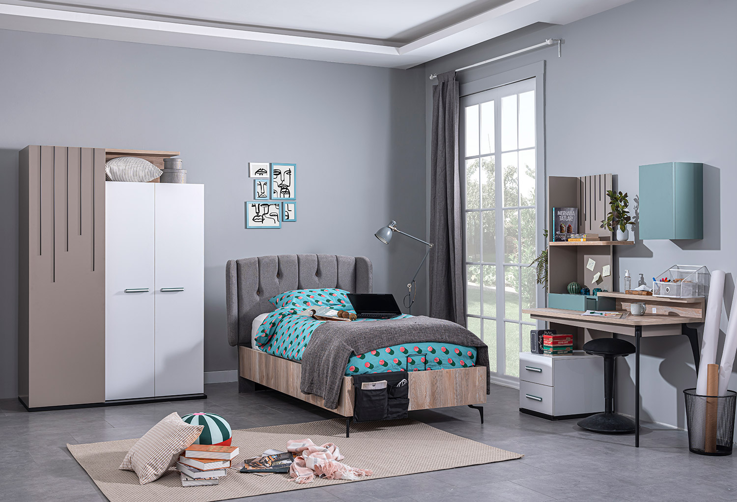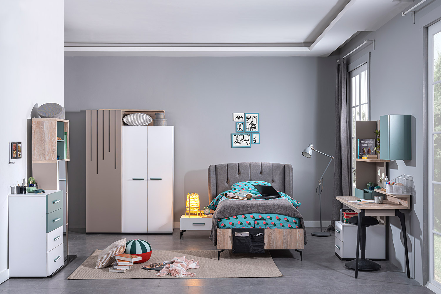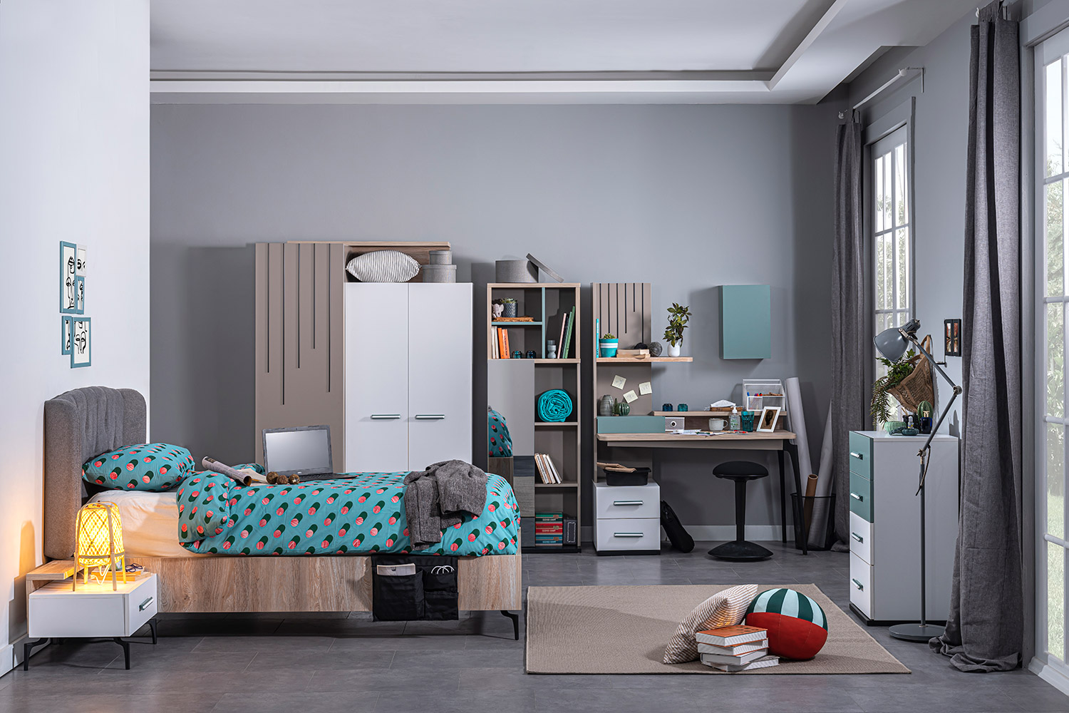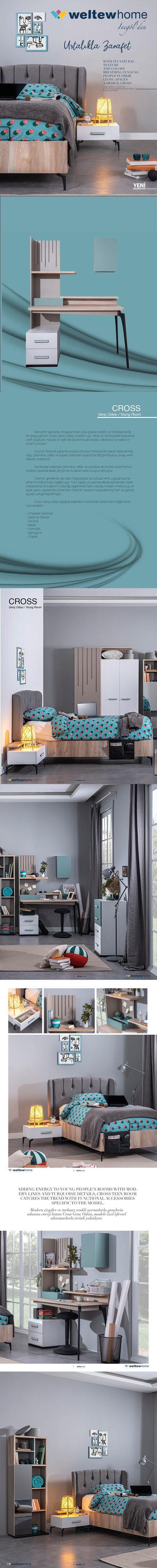 Modern çizgiler ve turkuaz renkli ayrıntılarla gençlerin odasına enerji katan Cross Genç Odası, modele özel işlevsel aksesuarlarla trendi yakalıyor.