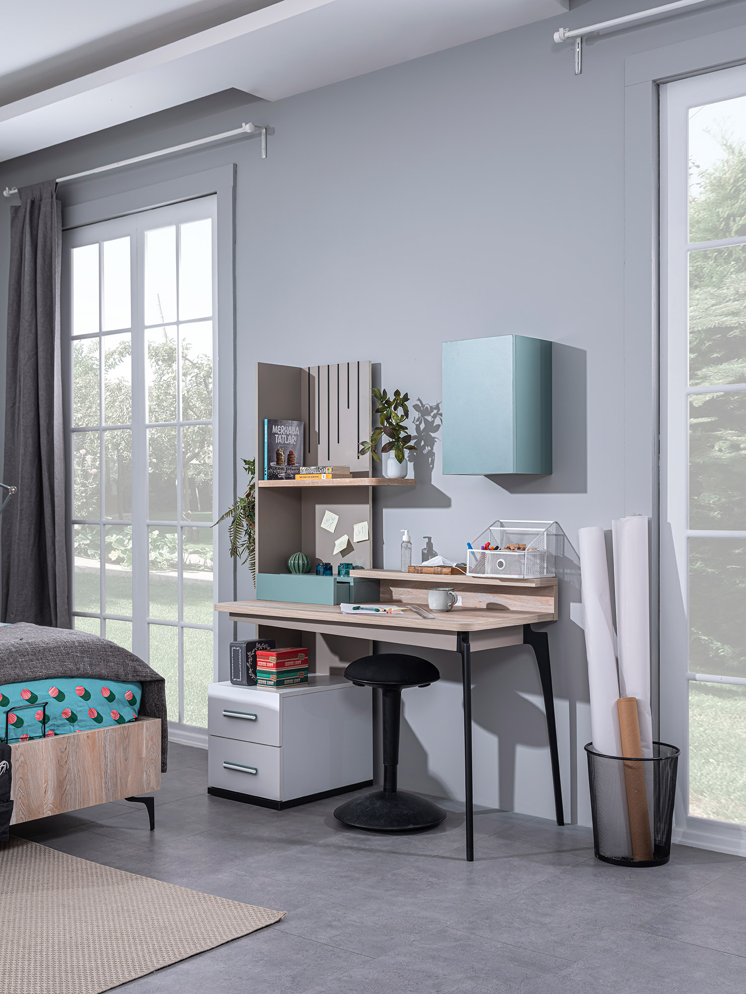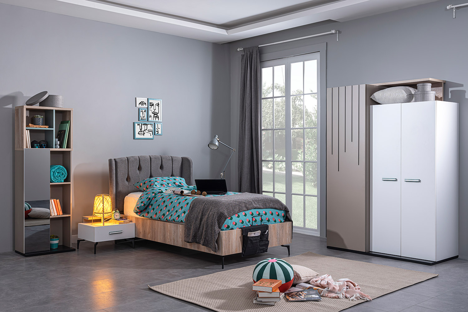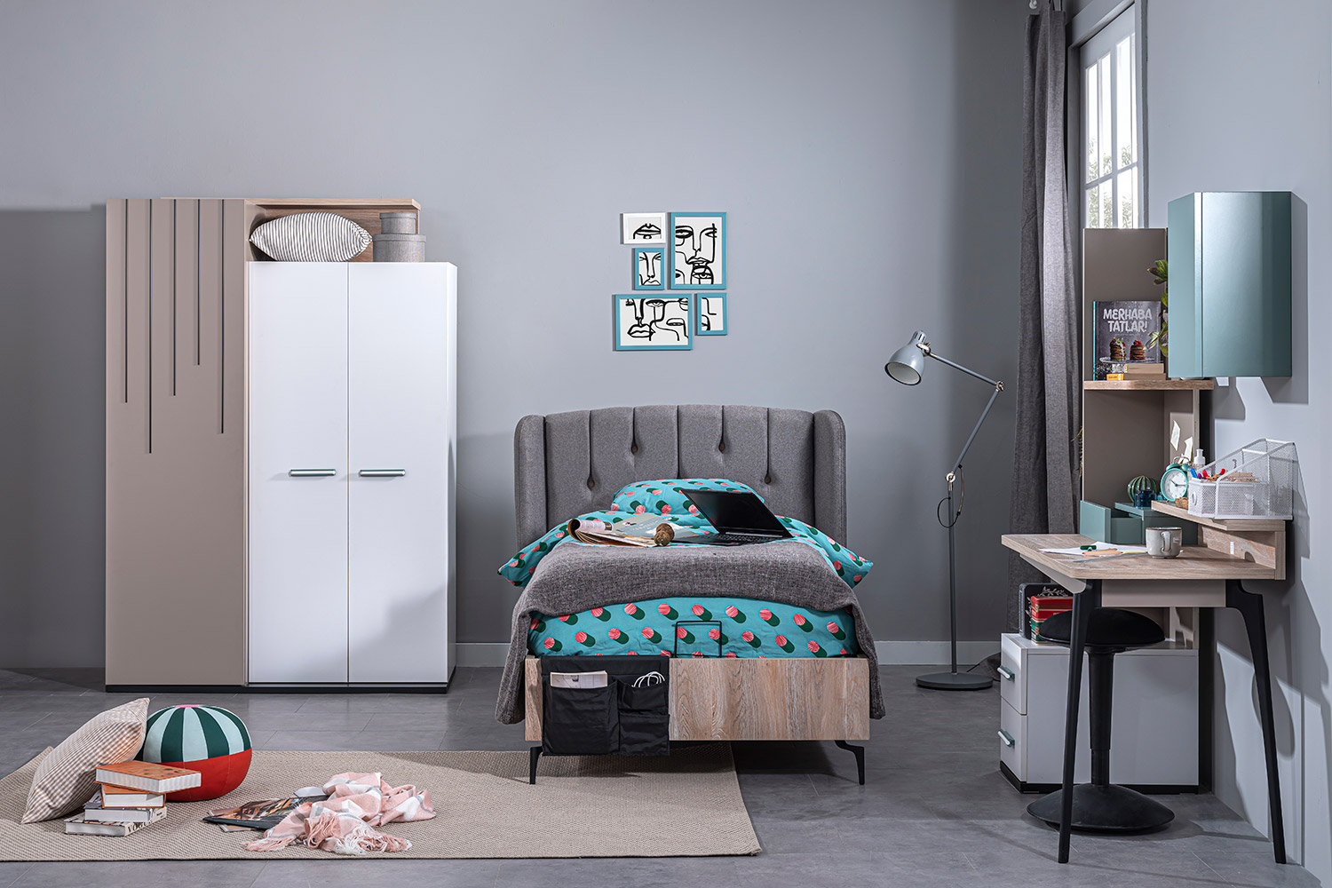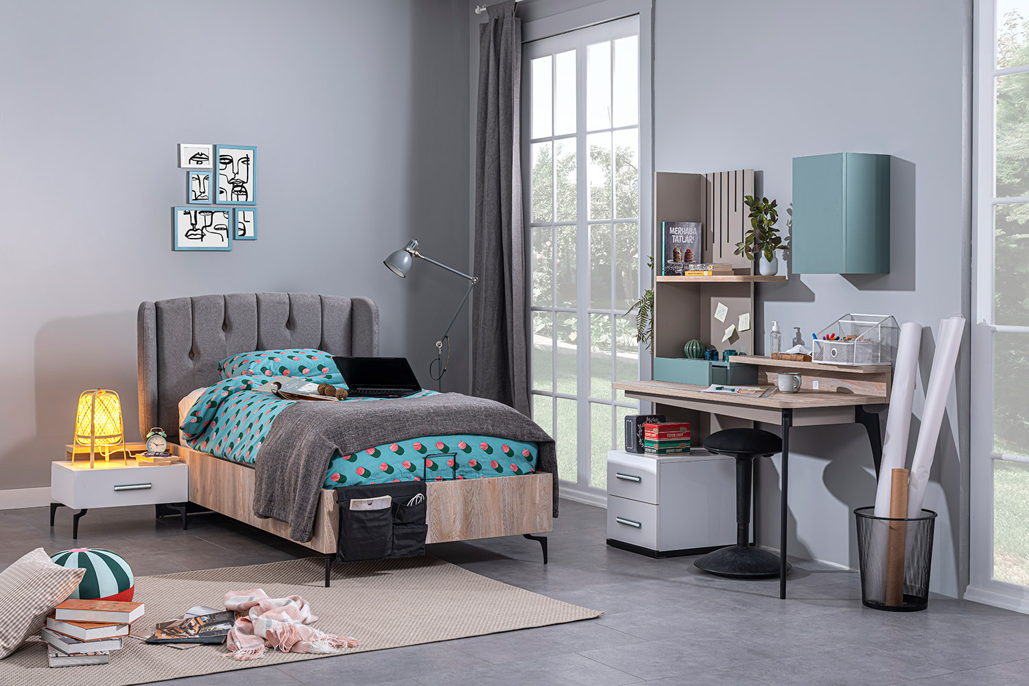 Modern çizgiler ve turkuaz renkli ayrıntılarla gençlerin odasına enerji katan Cross Genç Odası, modele özel işlevsel aksesuarlarla trendi yakalıyor.