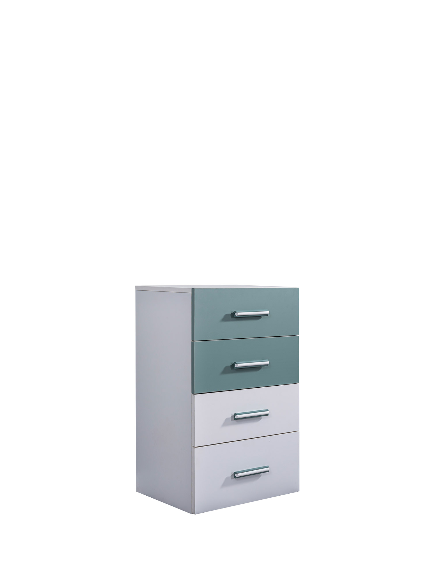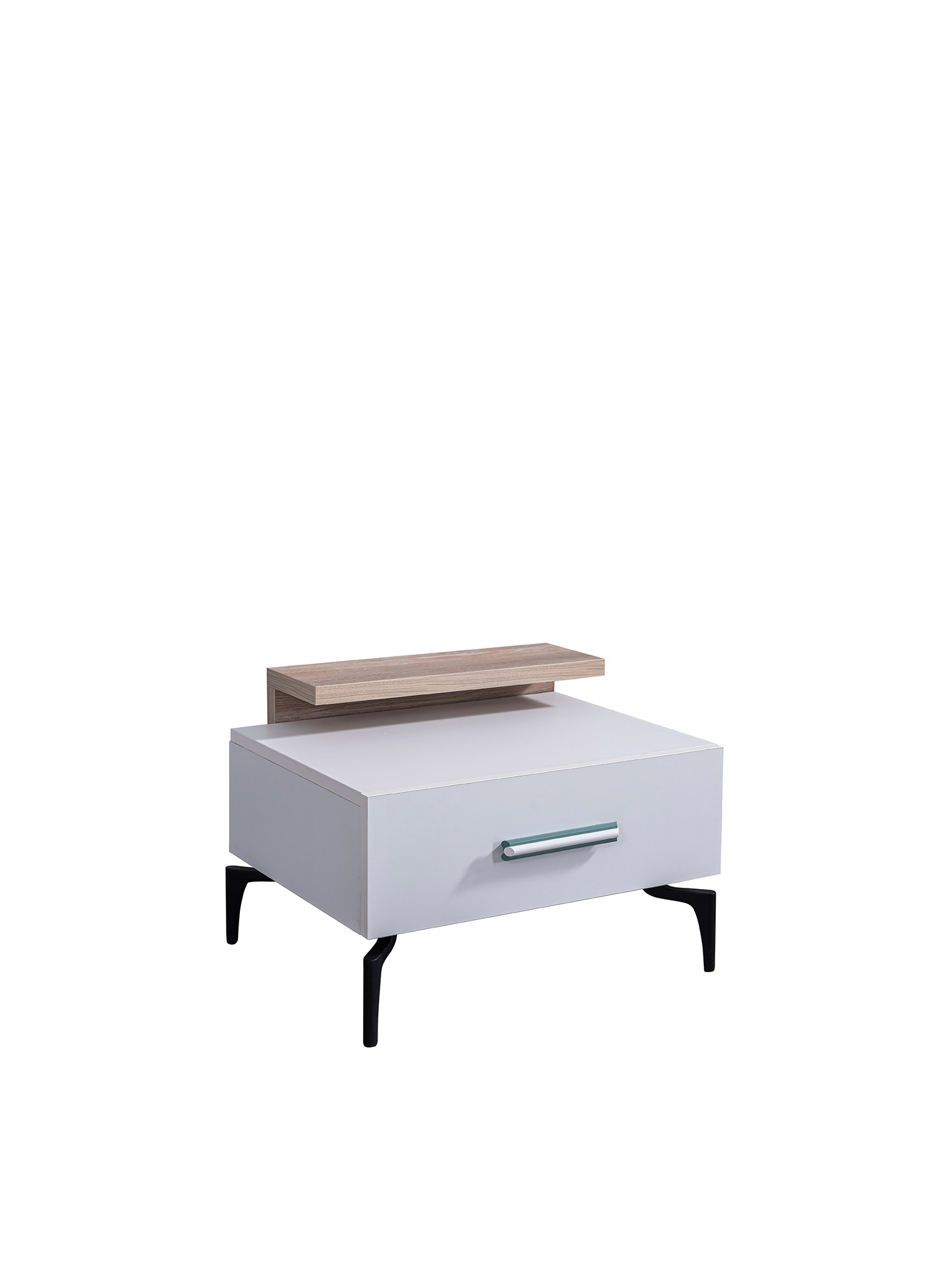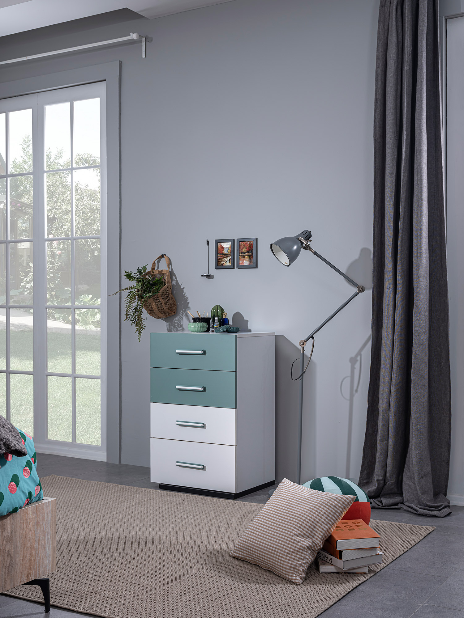 Komodin Malzemesi: Melamin kaplı yonga levhadan üretilmiştir. Kulpları plastiktir. Ayakları metaldir. Çekmece rayları frenli tandem raydır.