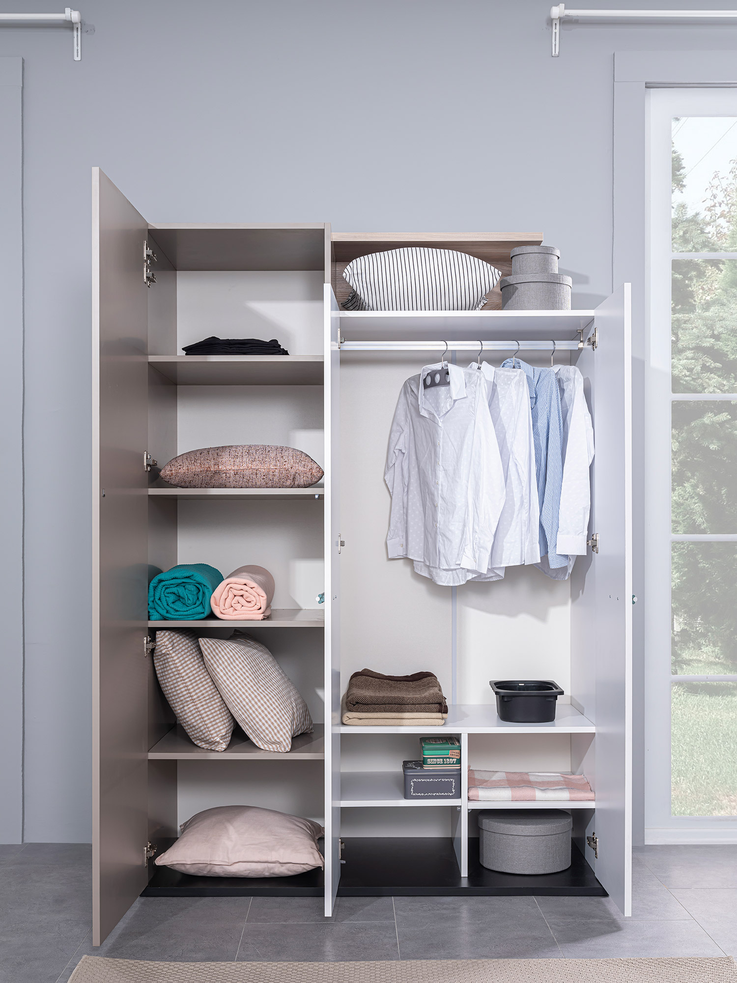 Gardropta kullanılan çekmece, raflar ve askılıklar ile birlikte ürüne fonksiyonellik kazandırılarak zengin bir kullanım alanı oluşturulmuştur.
