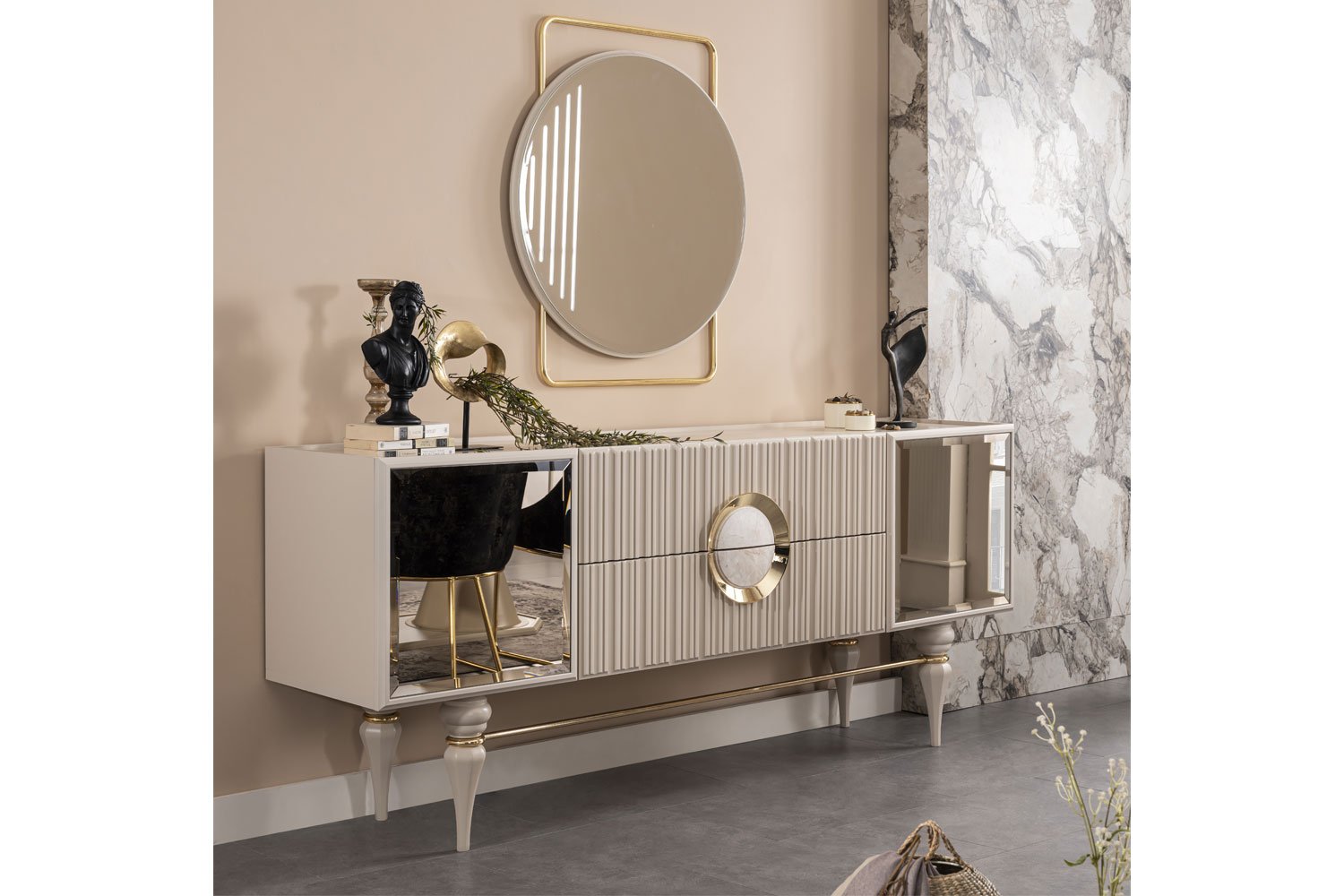 Konsol Malzemesi Gövde melamin kaplı yonga levha, çekmece önleri ve ayna pano ise boyalı Medium Density Fiberboard (MDF) malzemeden üretilmiştir. Ayakları boyalı ahşaptır. Aynı zamanda arka ayaklarda alt üst gövdenin arasında, aksesuar amacı ile kullanılan altın yaldız kaplı metal bilezik bulunmaktadır. Ön ayaklarda ise metal silindir çubuğun iki tarafına bu metal bilezikler kaynatıldıktan sonra altın yaldız kaplanarak elde edilen aksesuar kullanılmıştır. Kulpları altın yaldız kaplı metal ve mermer desenli plastik gövdeden oluşmaktadır. Çekmece rayları frenli tandem raydır. Kapakların etrafında PVC kaplı ahşap çerçeve profiller yer almaktadır. Ayna pano arkasında ise görsel amaçlı olarak, altın yaldız kaplamalı metal mevcuttur ve çapraz kesimli parçalar yardımı ile duvara asılmaktadır.