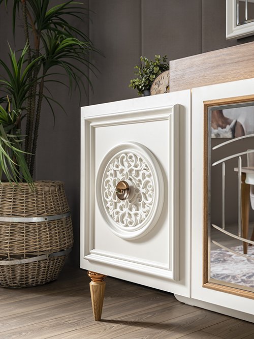 Konsol Malzemesi Suntalam malzemeden üretilmiştir.Altı ahşap desenli üstü bronz kaplama pilastik ayak kullanılmıştır.Sağ sol dış kapaklarda mdf profil, plastik desen ve bronz kaplı metal kulp kullanılmıştır.Orta kapaklarda ahşap desenli mdf profil ve lazemli bronz ayna kullanılmıştır.Çekmecelerde telskopik çift açılımlı ray kullanılmıştır.Aynaların dört tarafına mdf profil dönülmüş olup lazemli bronz ayna ile kombine edilmiştir.