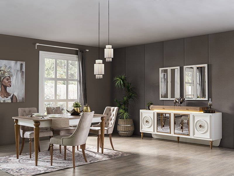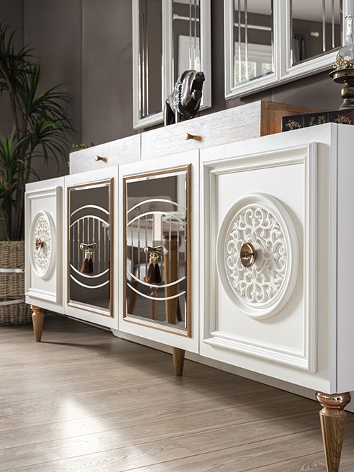 Konsol Malzemesi Suntalam malzemeden üretilmiştir.Altı ahşap desenli üstü bronz kaplama pilastik ayak kullanılmıştır.Sağ sol dış kapaklarda mdf profil, plastik desen ve bronz kaplı metal kulp kullanılmıştır.Orta kapaklarda ahşap desenli mdf profil ve lazemli bronz ayna kullanılmıştır.Çekmecelerde telskopik çift açılımlı ray kullanılmıştır.Aynaların dört tarafına mdf profil dönülmüş olup lazemli bronz ayna ile kombine edilmiştir.
