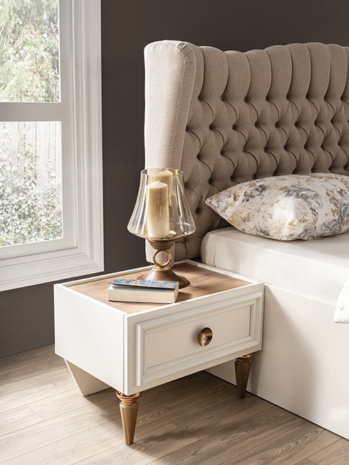 Komodin Malzemesi Suntalam malzemeden üretilmiştir.Çekmece önünde mdf profil ve bronz kaplı metal kulp kullanılmıştır.Altı ahşap desenli üstü bronz kaplama pilastik ayak kullanılmıştır.Çekmece rayları frenlidir.