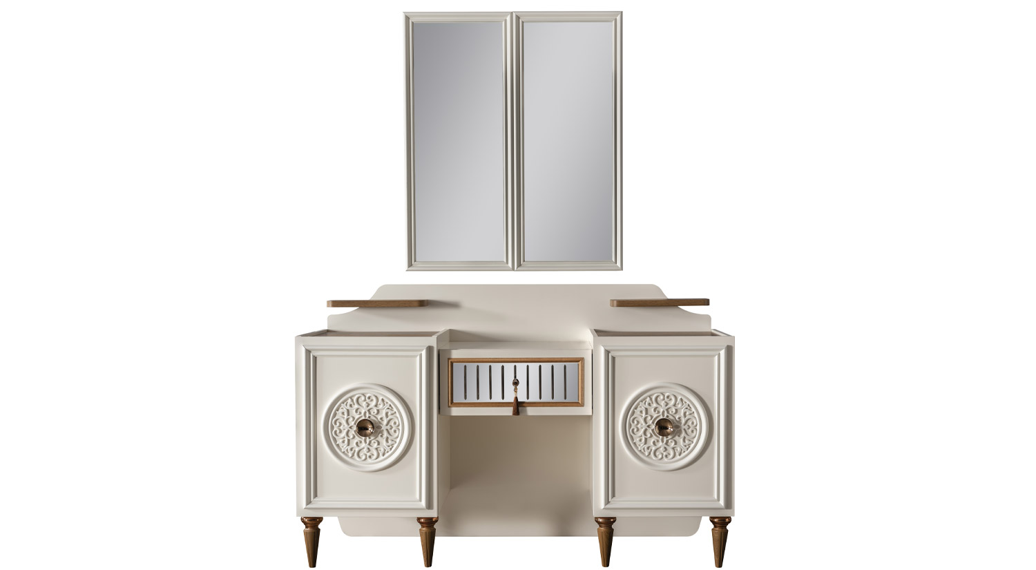 Şifonyer Malzemesi Suntalam malzemeden üretilmiştir.Kapaklarda mdf profil, plastik desen ve bronz kaplı metal kulp kullanılmıştır.Çemecede ahşap desenli mdf profil, lazemli bronz ayna ve bronz kaplı metal kulp kullanılmıştır.Altı ahşap desenli üstü bronz kaplama pilastik ayak kullanılmıştır.Çekmecede frenli ray kullanılmıştır.Aynaların dört tarafına mdf profil dönülmüştür.