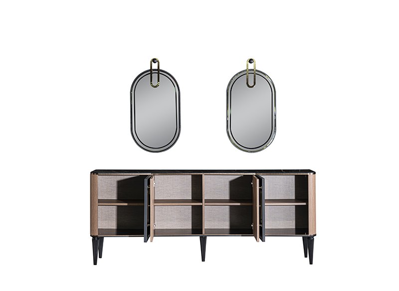 Konsol Malzemesi Suntalam malzemeden üretilmiştir. Dış kapakların etrafında PVC kaplı ahşap MDF profil yer almaktadır ve ön yüzeylerinde boyalı desenli ayna mevcuttur. Sağ - sol yanların ön kısmında PVC kaplı C MDF profil kullanılmıştır. Kapaklarda kendinden frenli menteşe kullanılmıştır. Ayakları plastiktir. Kulpları metaldir. Ayna panoları bronz kaplı metal ve mat siyah boyalı ahşap aksesuarlar yardımı ile duvara asılmaktadır.