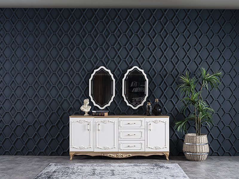 Gümüşlük Malzemesi: Gövde Suntalam, alt ve üst klapa MDF. Ayaklar plastiktir. Kupları metal üzerinde porselen bulunan malzemeden yapılmıştır. Alt ve üst klapada boyalı plastik desen bulunmaktadır. Çekmece rayları frenlidir. Kapaklarda kendinden frenli menteşe kullanılmıştır.