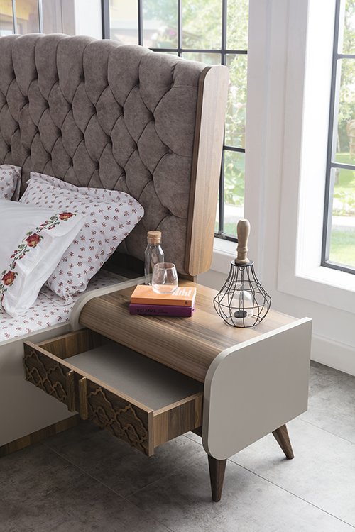 Baza Malzemesi Karyola çerçevesi 1. kalite suntalam malzemeden, baza kapağı ise demir profilden üretilmiştir.