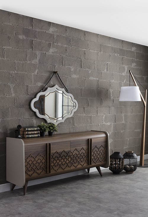 Konsol Malzemesi Gövde Suntalam, Kapaklarda MDF desen vardır. Kapak alt ve üstünde MDF papel bulunmaktadır. Ayaklar plastiktir. Kulpları metaldir. Ayna çerçevesi olarak boyalı MDF  kullanılmıştır.