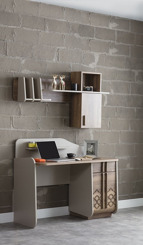 Çalışma Masası Malzemesi Suntalam malzemeden üretilmiştir. Kapak önünde MDF desen vardır. Kapak altında MDF papel bulunmaktadır. Kulpları metaldir. Kendinden frenli menteşeli kapak mekanizması vardır. Çekmece rayları frenlidir.