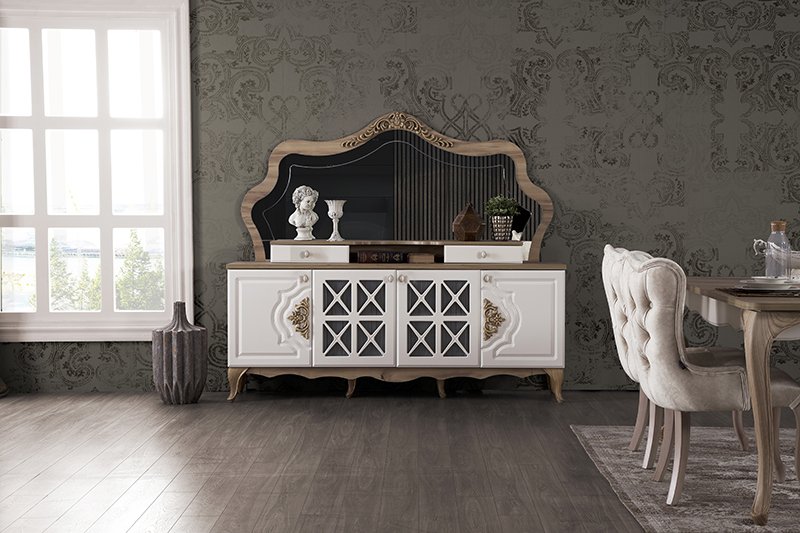 Konsol Malzemesi Gövde Suntalam, alt klapa MDF, kapaklar ve çekmece önleri boyalı MDF. Ayaklar plastiktir. Kupları metal üzerinde desenli taş bulunan malzemeden yapılmıştır. Ayna pano üstünde boyalı döküm desen bulunmaktadır.