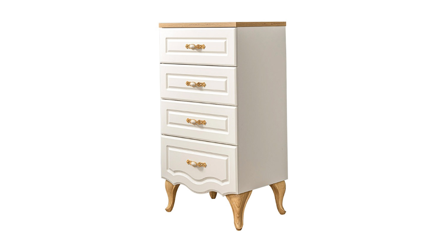 Komodin Malzemesi Suntalam malzemeden üretilmiştir. Çekmece önü boyalı MDF den üretilmiştir. Ayaklar plastiktir. Kupları metal üzerinde desenli taş bulunan malzemeden yapılmıştır. Çekmece rayları frenli tandem raydır.