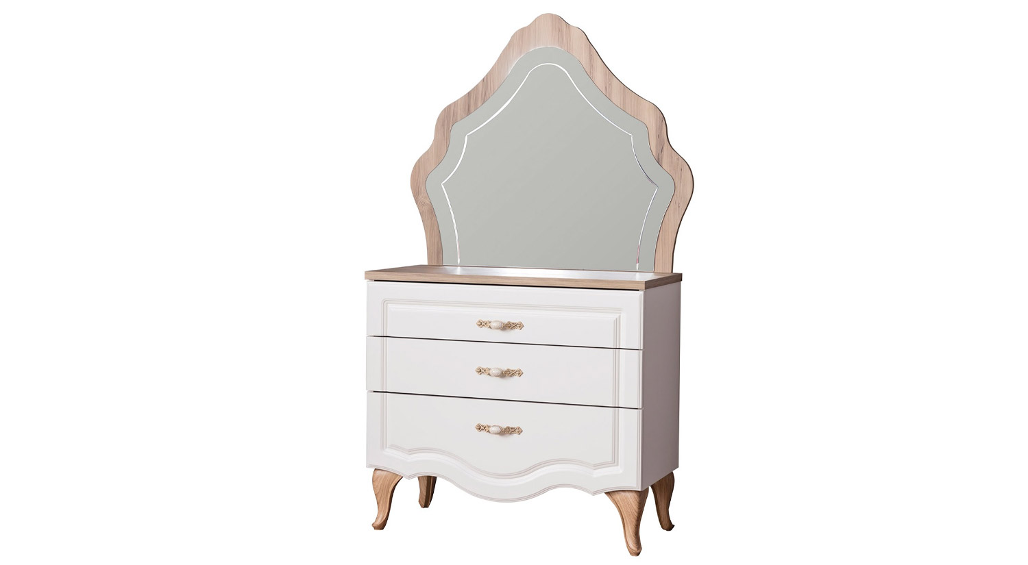 Şifonyer Malzemesi Suntalam malzemeden üretilmiştir. Çekmece önleri boyalı MDF den üretilmiştir. Ayaklar plastiktir. Kupları metal üzerinde desenli taş bulunan malzemeden yapılmıştır. Ayna üzerinde boyalı döküm desen bulunmaktadır. Çekmece rayları frenli tandem raydır.