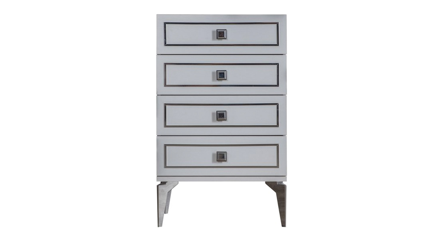 Komodin Malzemesi Melamin kaplı yonga levhadan üretilmiştir. Çekmece önlerinde krom renkli plastik sibu profil kullanılmıştır. Ayakları krom kaplı plastiktir. Kulpları krom kaplı plastik kulptur. Çekmece rayları çift açılımlı teleskopik raydır.
