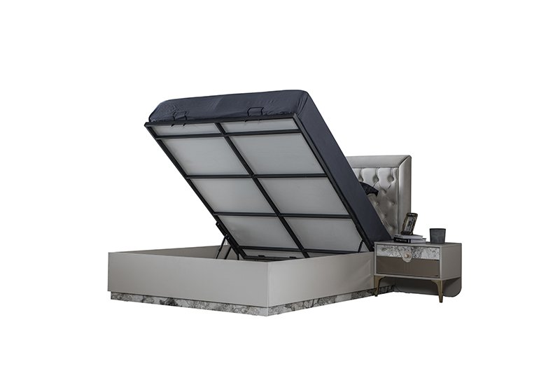 Baza Malzemesi Karyola çerçevesi 1. kalite melamin kaplı yonga levha malzemeden, baza kapağı ise demir profilden üretilmiştir.