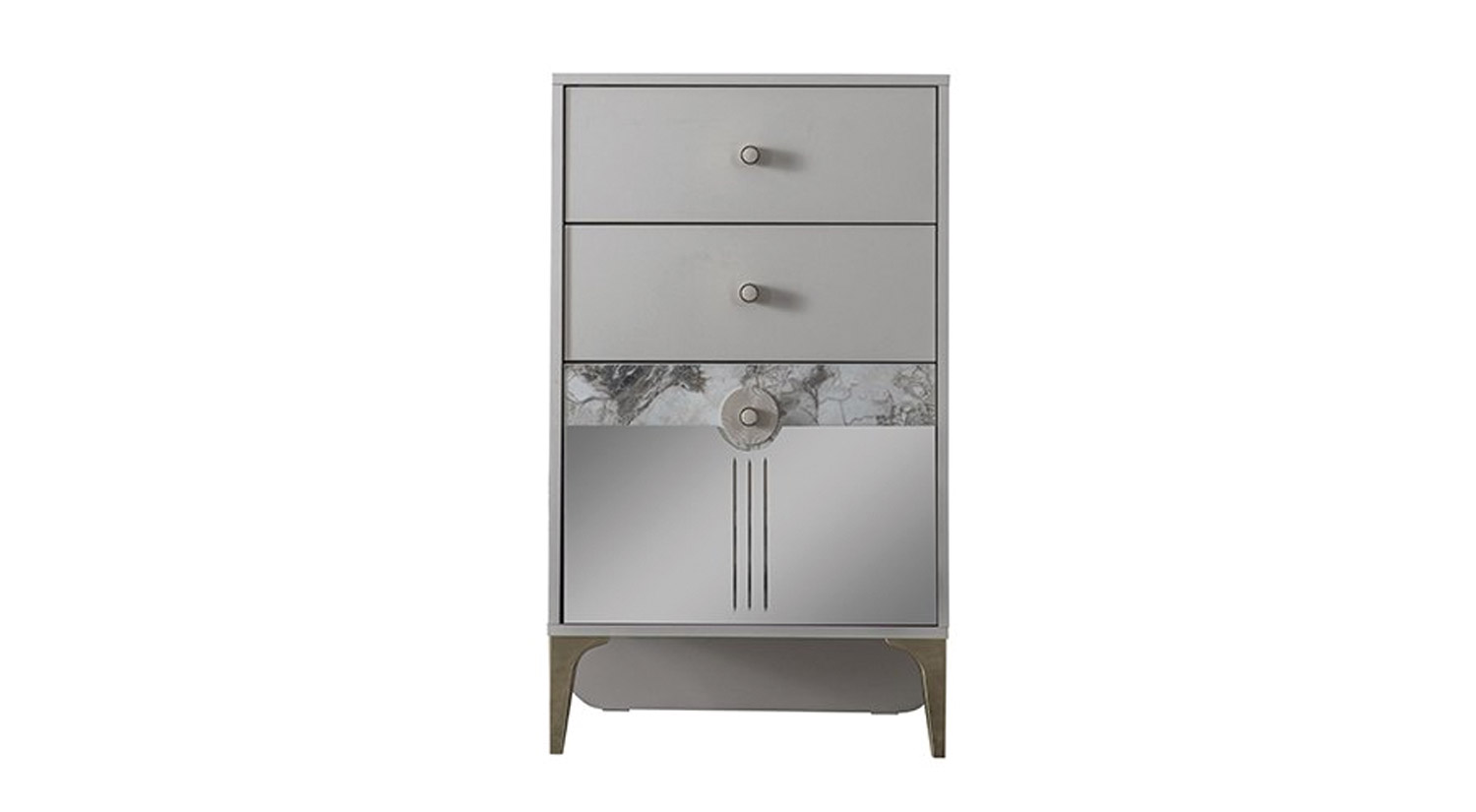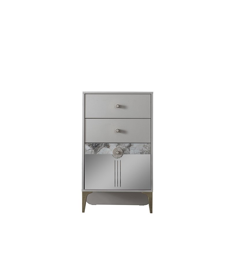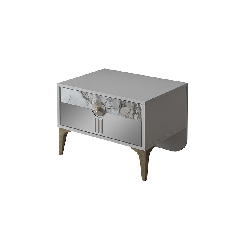 Komodin Malzemesi Melamin kaplı yonga levhadan üretilmiştir. Ayakları altın yaldız kaplı plastiktir. Kulpları altın yaldız kaplı yüksük, vizon bej gövde ve vizon bej tabandan oluşan plastik kulptur. Çekmece rayları çift açılımlı teleskopik raydır.