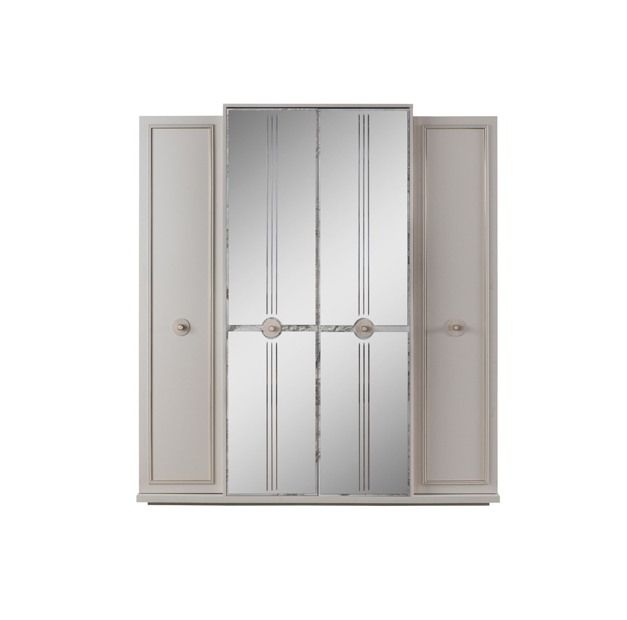 Gardırop Malzemesi Melamin kaplı yonga levhadan üretilmiştir. Sağ - sol blok kapaklarının üzerinde altın ve vizon bej renk kombinasyonu olan plastik sibu profil kullanılmıştır.
