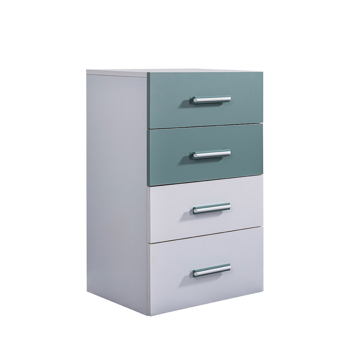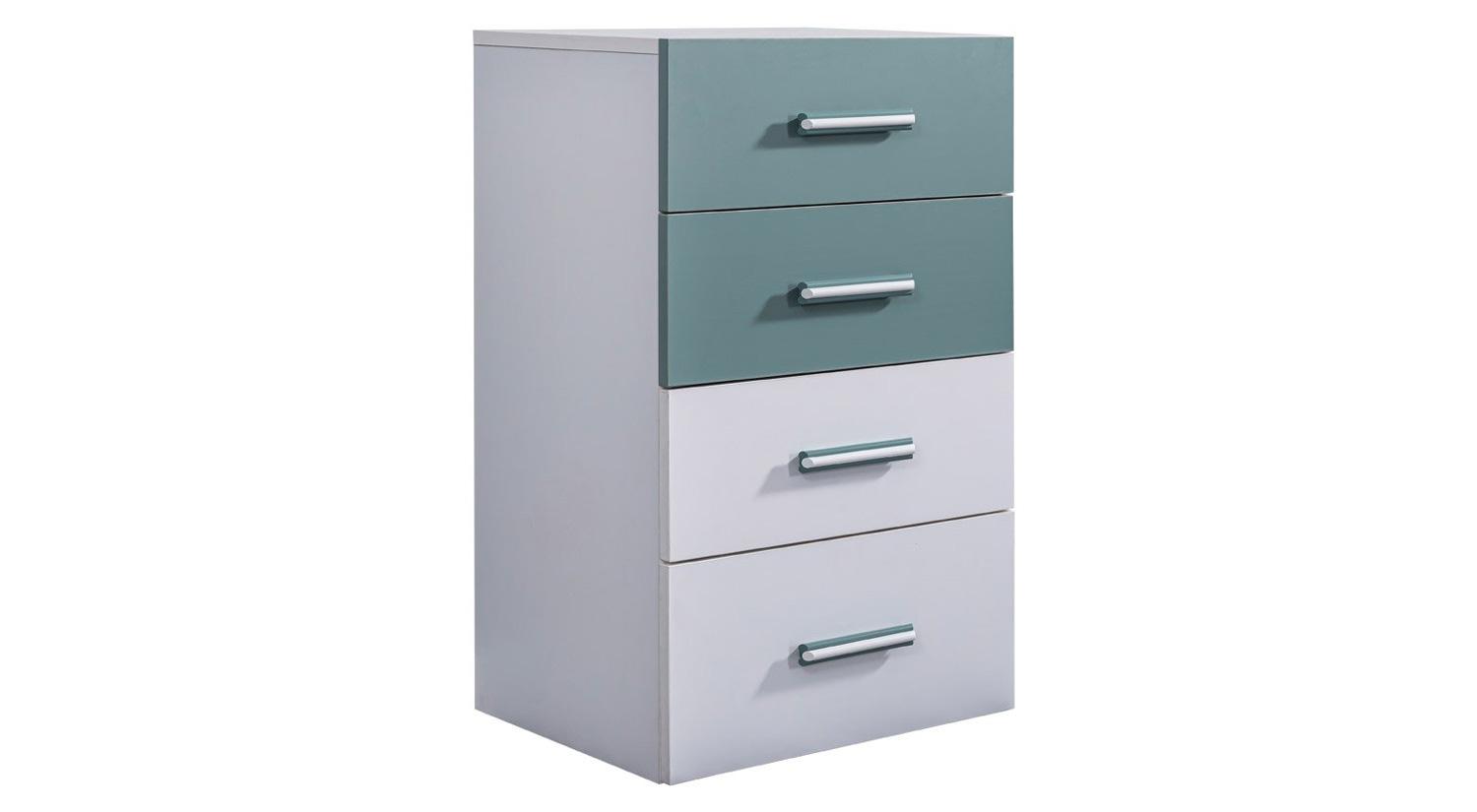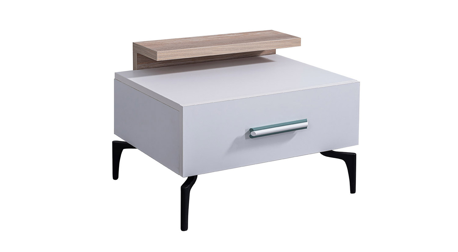 Komodin Malzemesi: Melamin kaplı yonga levhadan üretilmiştir. Kulpları plastiktir. Ayakları metaldir. Çekmece rayları frenli tandem raydır.
