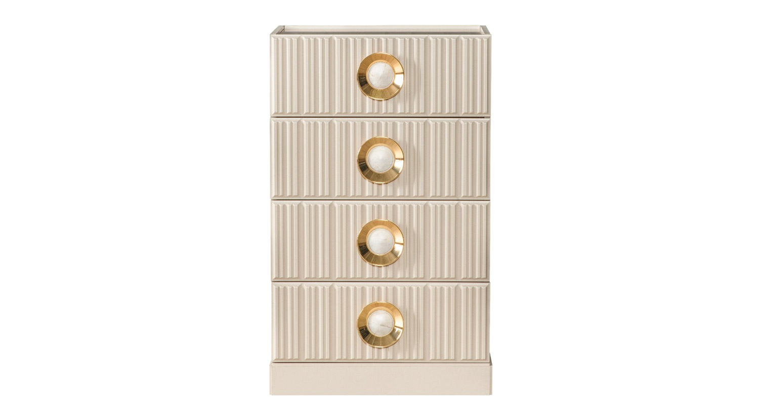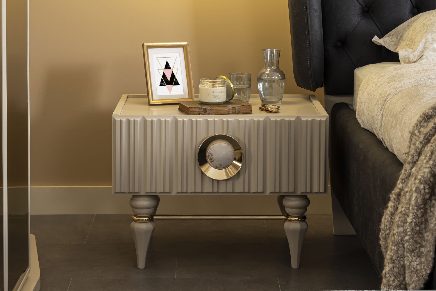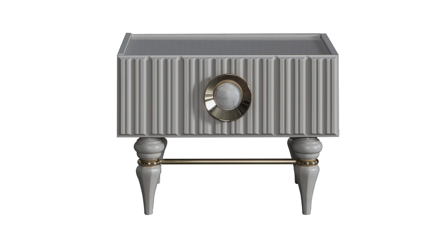 Komodin Malzemesi Gövde melamin kaplı yonga levha, çekmece önü ise boyalı Medium Density Fiberboard (MDF) malzemeden üretilmiştir. Ayakları boyalı ahşaptır. Aynı zamanda arka ayaklarda alt üst gövdenin arasında, aksesuar amacı ile kullanılan altın yaldız kaplı metal bilezik bulunmaktadır. Ön ayaklarda ise metal silindir çubuğun iki tarafına bu metal bilezikler kaynatıldıktan sonra altın yaldız kaplanarak elde edilen aksesuar kullanılmıştır. Kulpları altın yaldız kaplı metal ve mermer desenli plastik gövdeden oluşmaktadır. Çekmece rayları frenli tandem raydır.