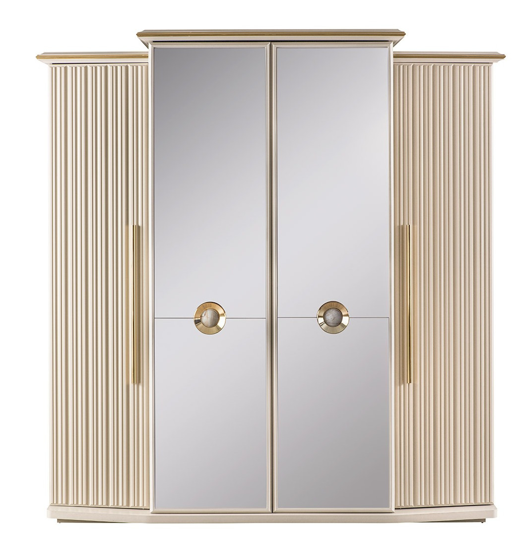 Gardırop Malzemesi Melamin kaplı yonga levha ve sağ - sol dış kapaklar ise boyalı Medium Density Fiberboard (MDF) malzemeden üretilmiştir. Orta kapakların etrafında PVC kaplı ahşap çerçeve profiller yer almaktadır ve üst tablaların kenarlarında PVC kaplı Medium Density Fiberboard (MDF) ve plastik sibu profil bir arada kullanılmıştır.