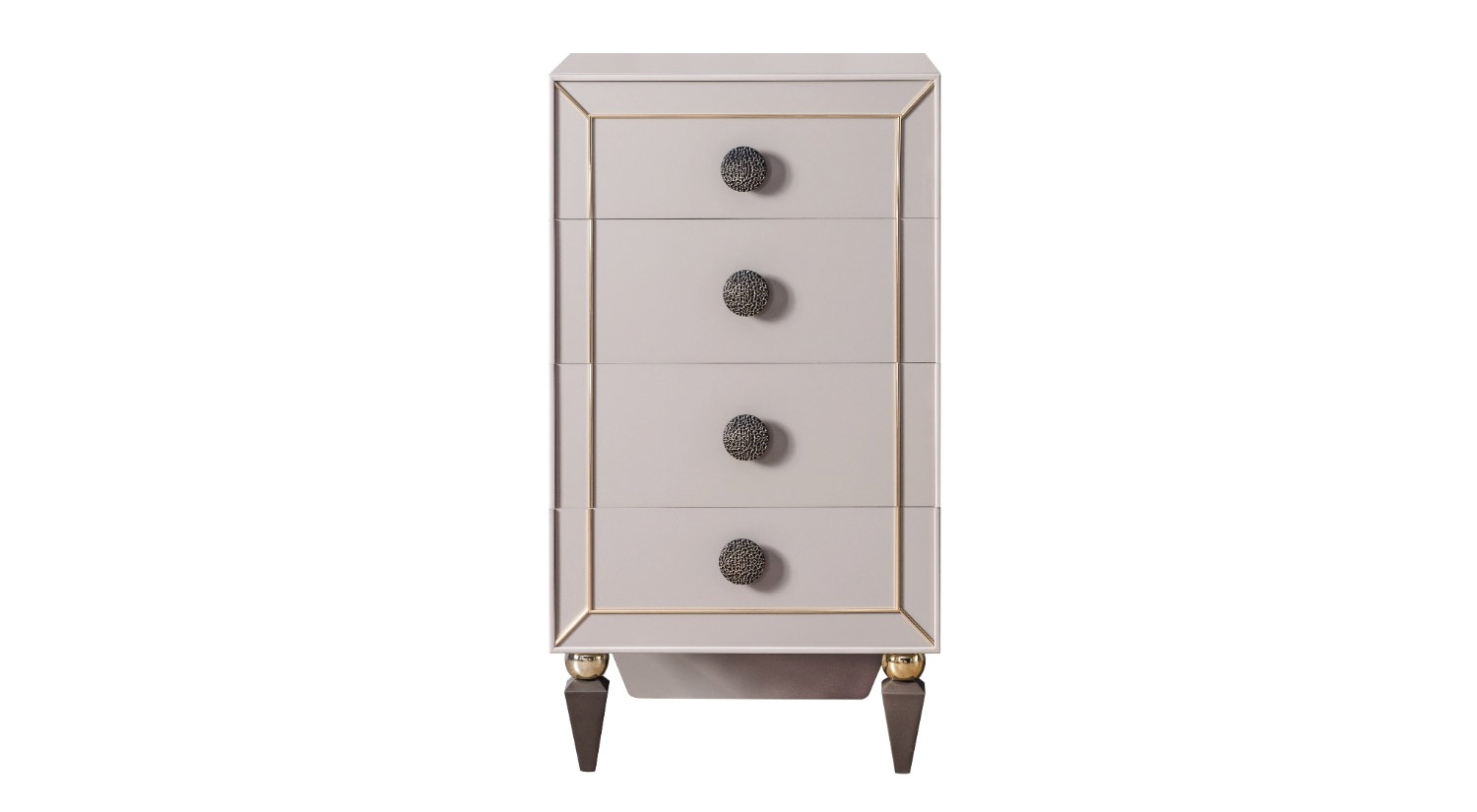 Komodin Malzemesi Suntalam malzemeden üretilmiştir. Çekmece önünde MDF çerçeve profil ve altın yaldızlı sibu vardır. Ayakları boyalı ahşaptır. Kulpları metaldir. Çekmece rayları frenlidir.