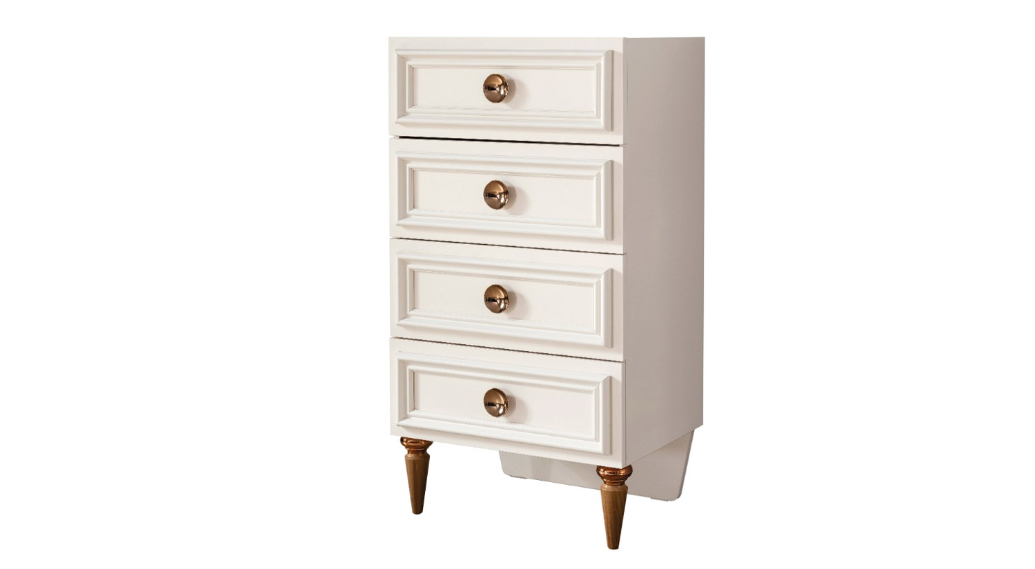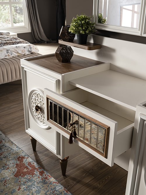 Komodin Malzemesi Suntalam malzemeden üretilmiştir.Çekmece önünde mdf profil ve bronz kaplı metal kulp kullanılmıştır.Altı ahşap desenli üstü bronz kaplama pilastik ayak kullanılmıştır.Çekmece rayları frenlidir.