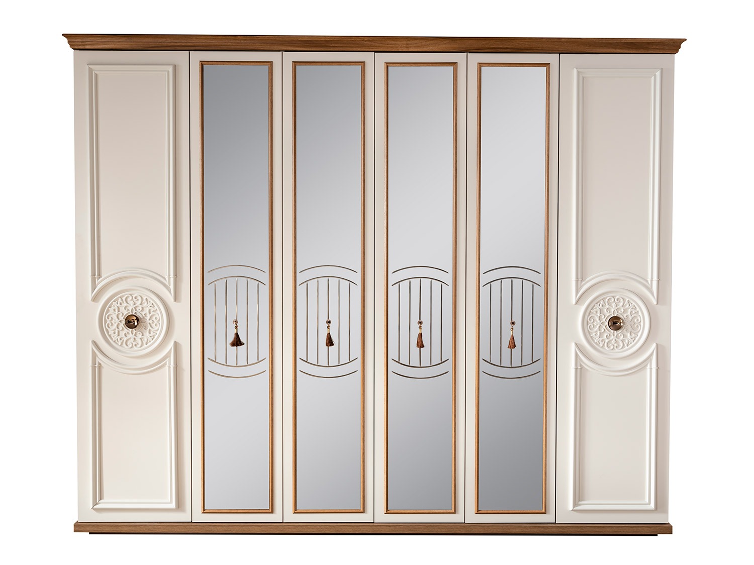 Gardırop Malzemesi Dolap içinde 1. kalite suntalam kullanılmıştır.Dış kapaklarda mdf profil, plastik desen ve bronz kaplı metal kulp kullanılmıştır.Orta kapaklarda ahşap desenli mdf profil ve lazemli bronz ayna kullanılmıştır.Dolabın üstünde ahşap desenli mdf profil taç olarak kullanılmıştır.