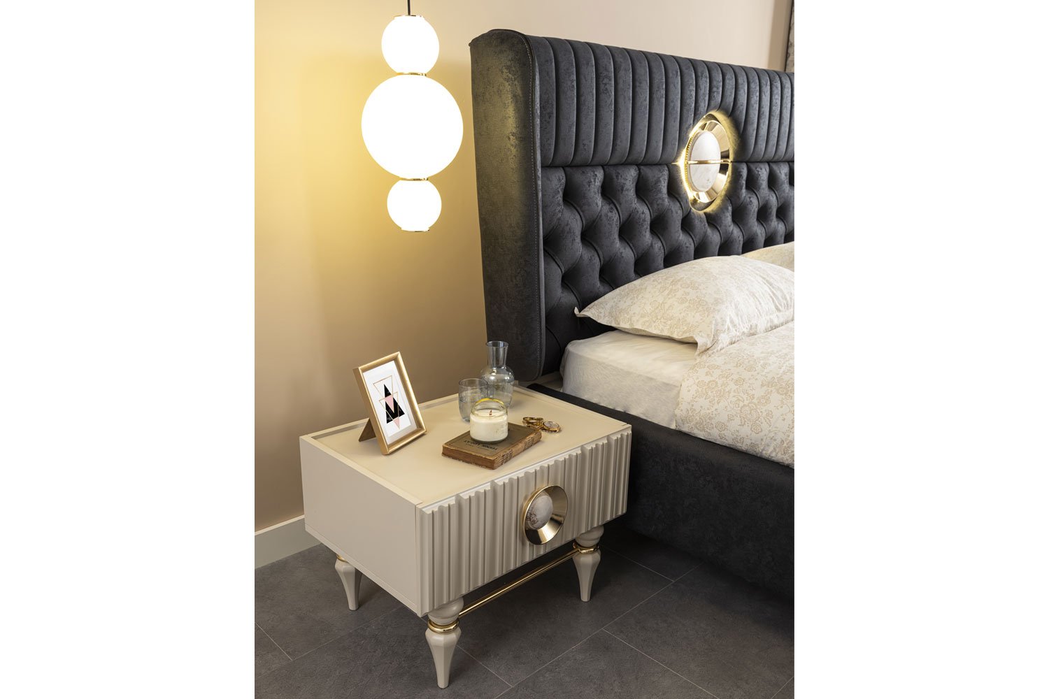 Komodin Malzemesi Gövde melamin kaplı yonga levha, çekmece önü ise boyalı Medium Density Fiberboard (MDF) malzemeden üretilmiştir. Ayakları boyalı ahşaptır. Aynı zamanda arka ayaklarda alt üst gövdenin arasında, aksesuar amacı ile kullanılan altın yaldız kaplı metal bilezik bulunmaktadır. Ön ayaklarda ise metal silindir çubuğun iki tarafına bu metal bilezikler kaynatıldıktan sonra altın yaldız kaplanarak elde edilen aksesuar kullanılmıştır. Kulpları altın yaldız kaplı metal ve mermer desenli plastik gövdeden oluşmaktadır. Çekmece rayları frenli tandem raydır.