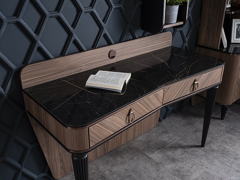 Çalışma Masası Malzemesi: Melamin kaplı yonga levhadan üretilmiştir. Alt çekmece blok sağ - sol yanların ön kısmında PVC kaplı orta yoğunluktaki lif levhadan yapılmış C profil kullanılmıştır. Ayakları boyalı ahşap ayaktır. Kulpları metaldir. Çekmece rayları frenli tandem raydır.