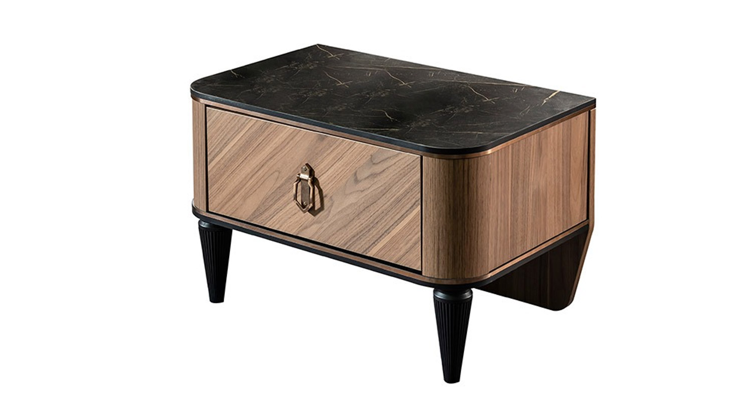 Komodin Malzemesi Suntalam malzemeden üretilmiştir. Sağ - sol yanların ön kısmında PVC kaplı C MDF profil kullanılmıştır. Ayakları plastiktir. Kulpları metaldir. Çekmece rayları frenli tandem raydır.