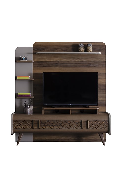 TV Ünitesi Malzemesi Gövde Suntalam, çekmece önleri MDF desenlidir. Çekmece alt ve üstünde MDF papel bulunmaktadır. Ayaklar plastiktir. Kulpları metaldir. Çekmece rayları frenlidir.
