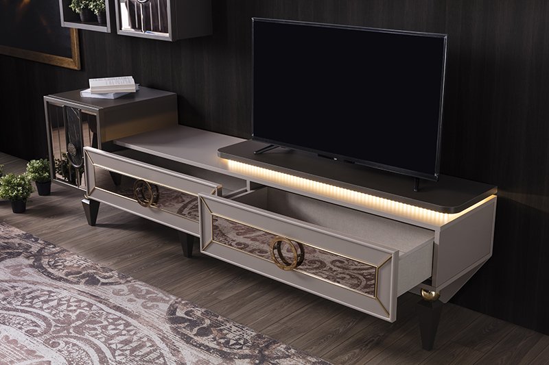 TV Ünitesi Malzemesi Suntalam malzemeden üretilmiştir. Çekmece önünde MDF çerçeve profil ve altın yaldızlı sibu vardır. Ayakları boyalı ahşaptır. Kulpları metaldir. Çekmece rayları frenlidir. Kapaklarda PVC kaplı çerçece MDF profil kullanılmıştır.
