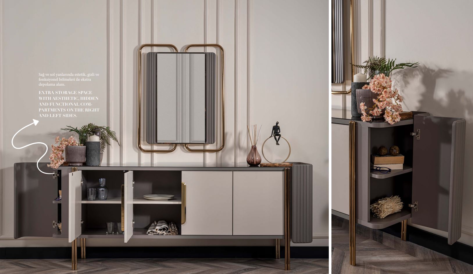 Sağ ve sol yanlarında estetik, gizli ve fonksiyonel bölmeleri ile ekstra depolama alanı.