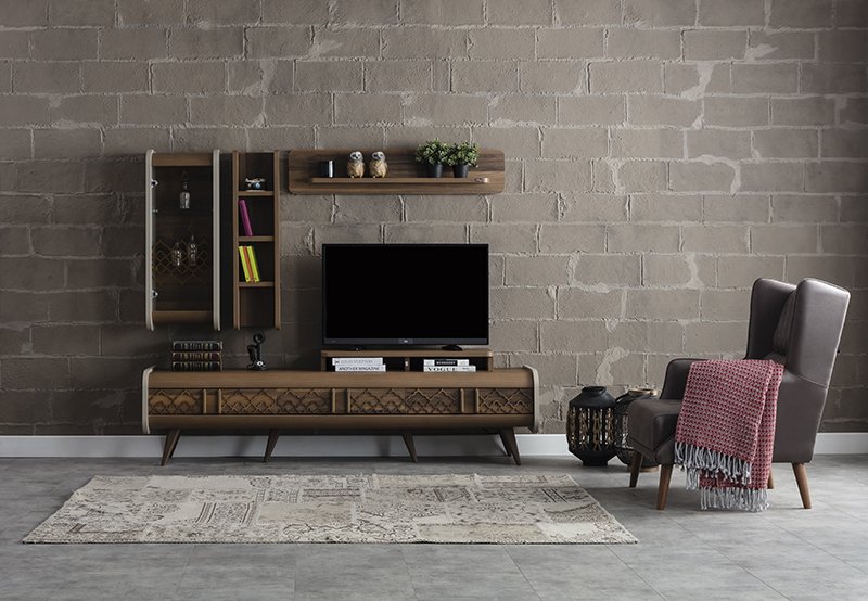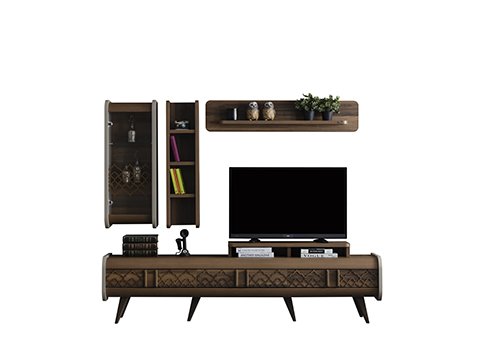 TV Ünitesi Malzemesi Gövde Suntalam, çekmece önleri MDF desenlidir. Çekmece alt ve üstünde MDF papel bulunmaktadır. Ayaklar plastiktir. Kulpları metaldir. Çekmece rayları frenlidir.