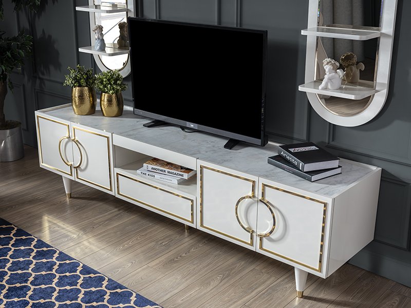 TV Ünitesi Malzemesi Suntalam malzemeden üretilmiştir. Ayakları boyalı plastik ayaktır. Kulpları altın kaplı metaldir.Kapaklarda ve çekmece önünde altın renkli sibu kullanılmıştır.Çekmece rayları frenlidir.