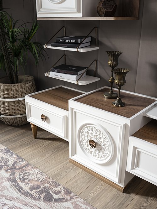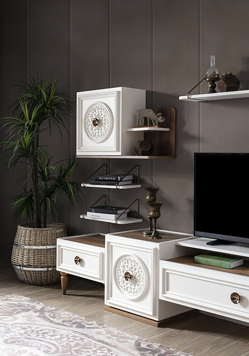 TV Ünitesi Malzemesi Suntalam malzemeden üretilmiştir.Altı ahşap desenli üstü bronz kaplama pilastik ayak kullanılmıştır.Alt ve üst kapaklarda mdf profil, plastik desen ve bronz kaplı metal kulp kullanılmıştır.Çekmecelerde mdf profil ve bronz kaplı metal kulp kullanılmıştır.Çekmece rayları frenlidir.Raflar bronz kaplı metal aksesuarla duvara montajlanmaktadır.